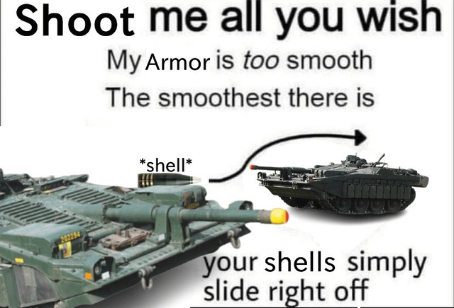 "Shoot me all you wish. My chest is too smooth. The smoothest there is. Your shells simply slide right off"